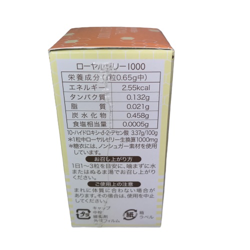 [原材料名] ローヤルゼリー末、還元麦芽糖水飴、とうもろこし澱粉、もち米、還元水飴/HPC-L、ステアリン酸カルシウム、粉末セルロース、加工澱粉、シェラック